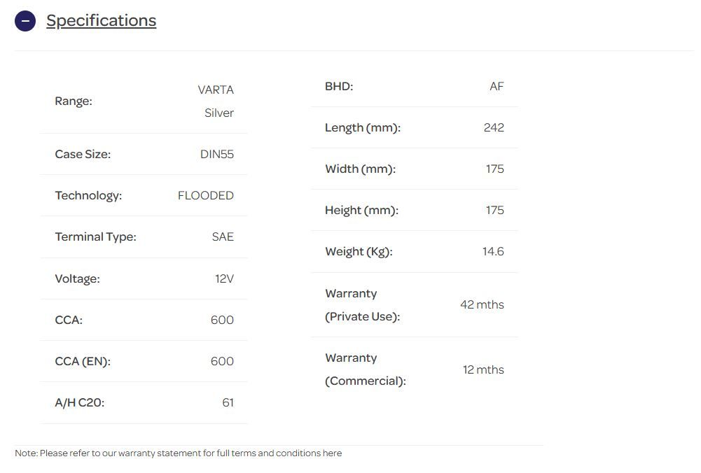 12V 600CCA(EN) 110RC VARTA FLD SILVER DYNAMIC DIN55 SAE 0 242MM X 175MM X 175MM