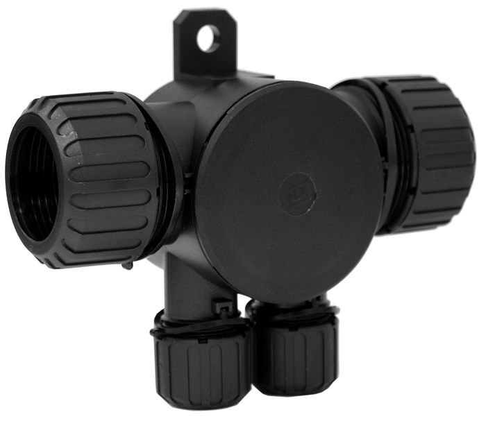 4 WAY T PIECE MANIFOLD SUITS 25MM AND 12MM NON SPLIT CONDUIT WITH MOUNTING BRACKET