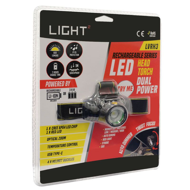 LIGHT2 RECHARGEABLE LED HEAD TORCH WITH FOCUS ADJUSTMENT & LITHIUM BATTERY
