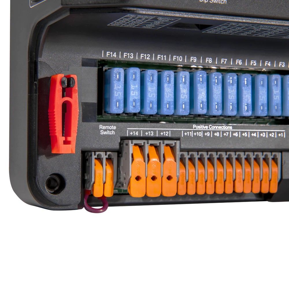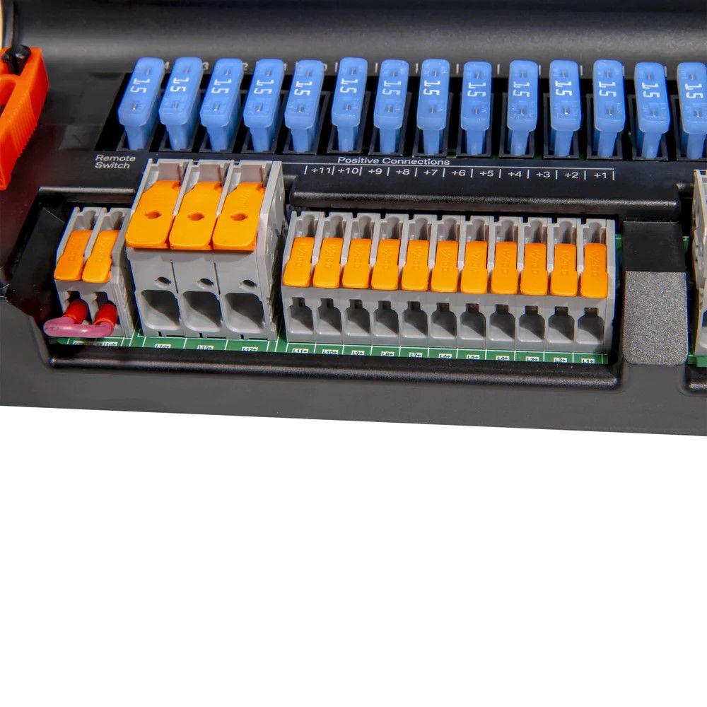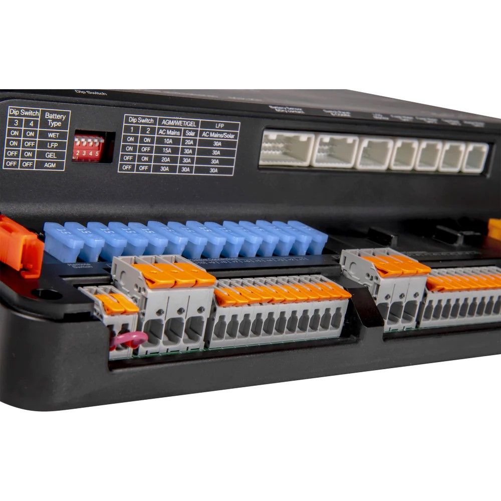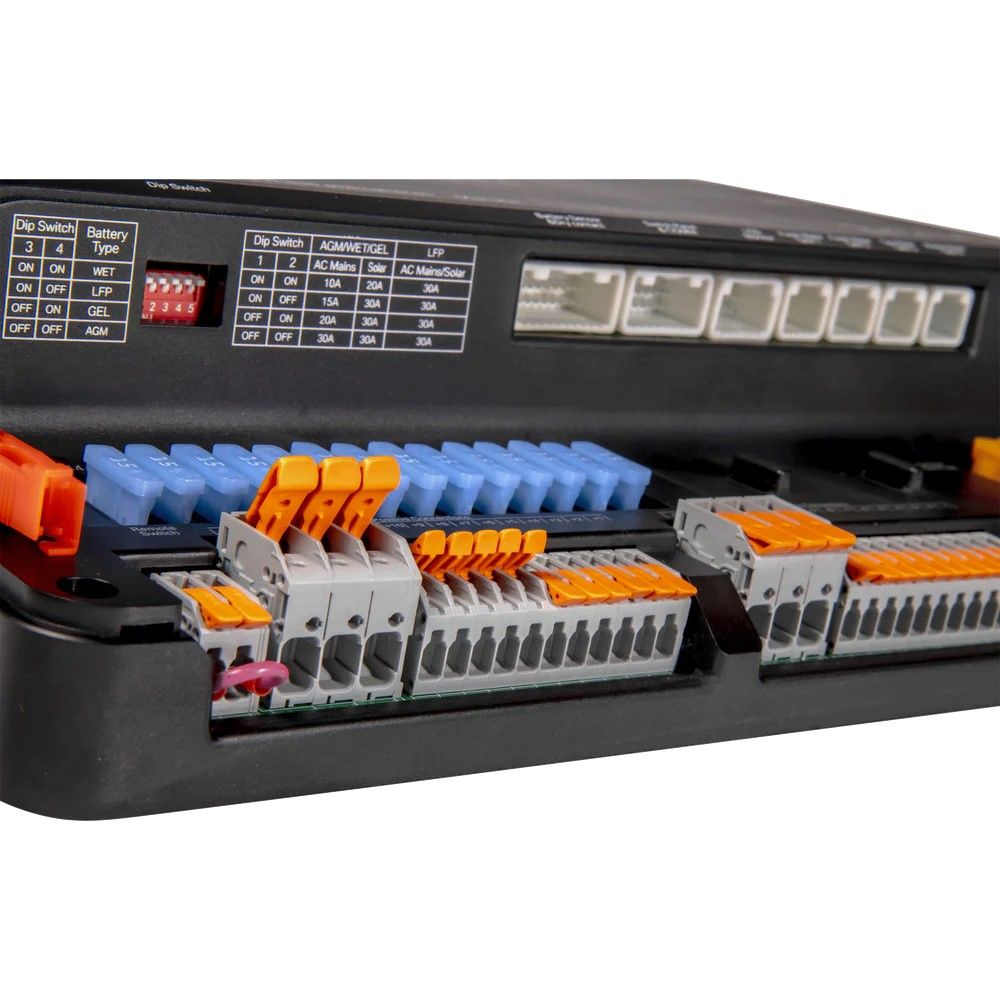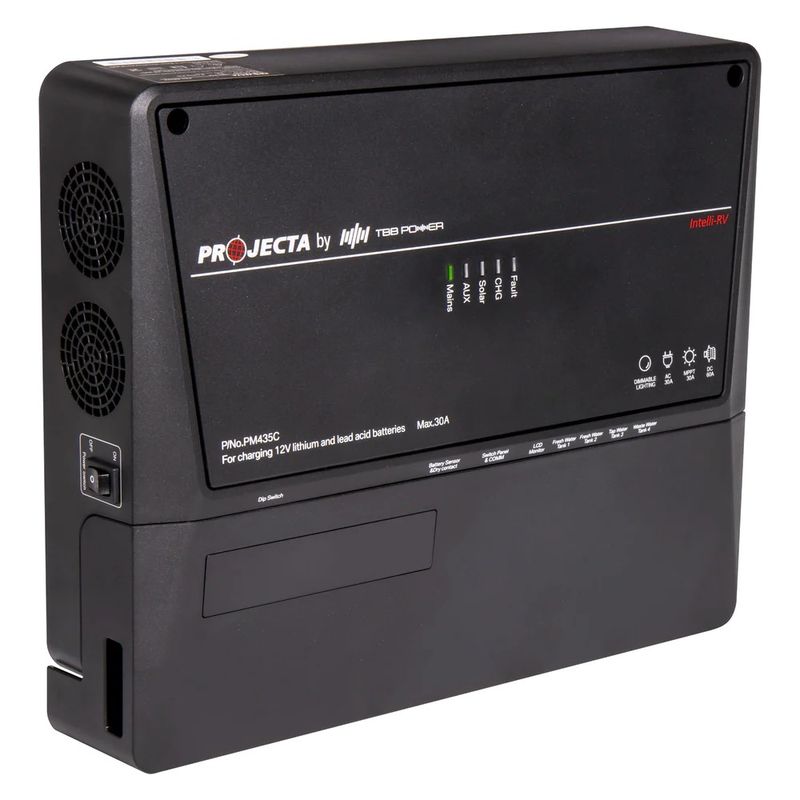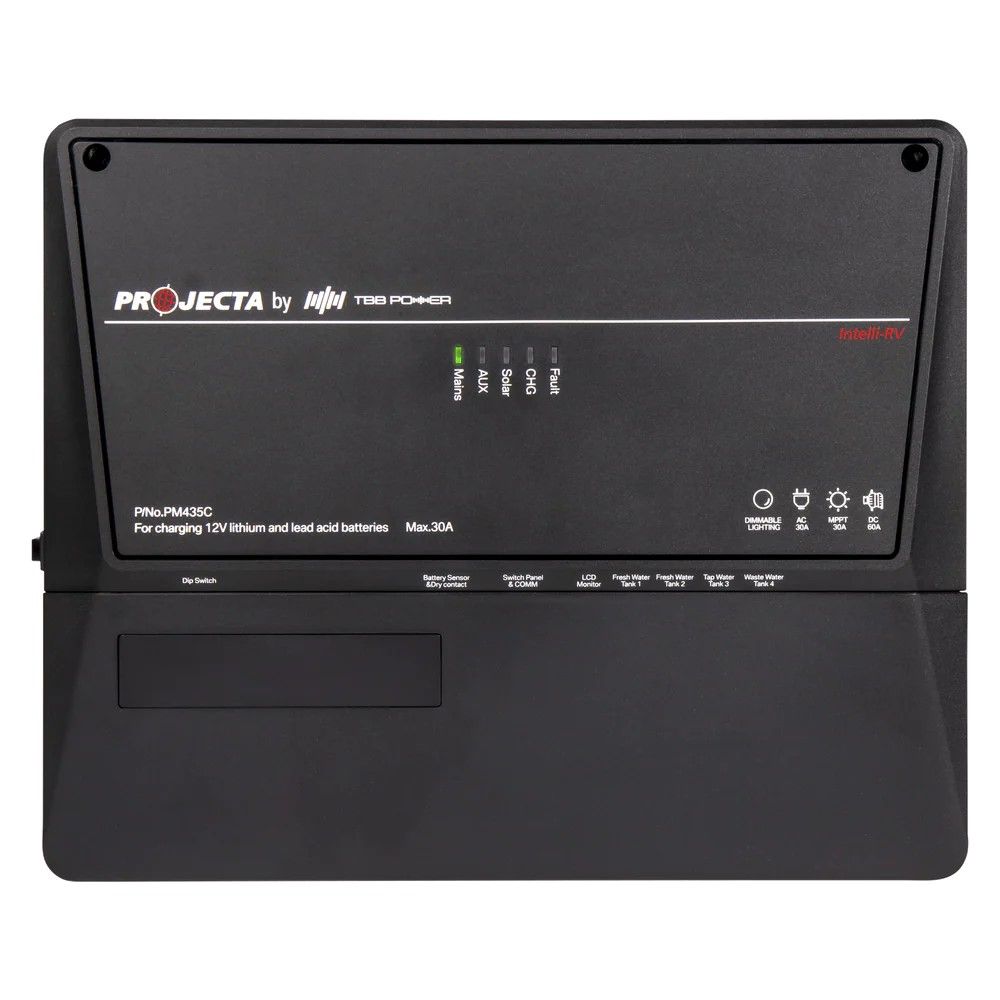 Part of the Projecta Low-Profile Intelli-RV range, serving as a compact power management unit. It centralises wiring with a slim design, making battery power and solar management straightforward.