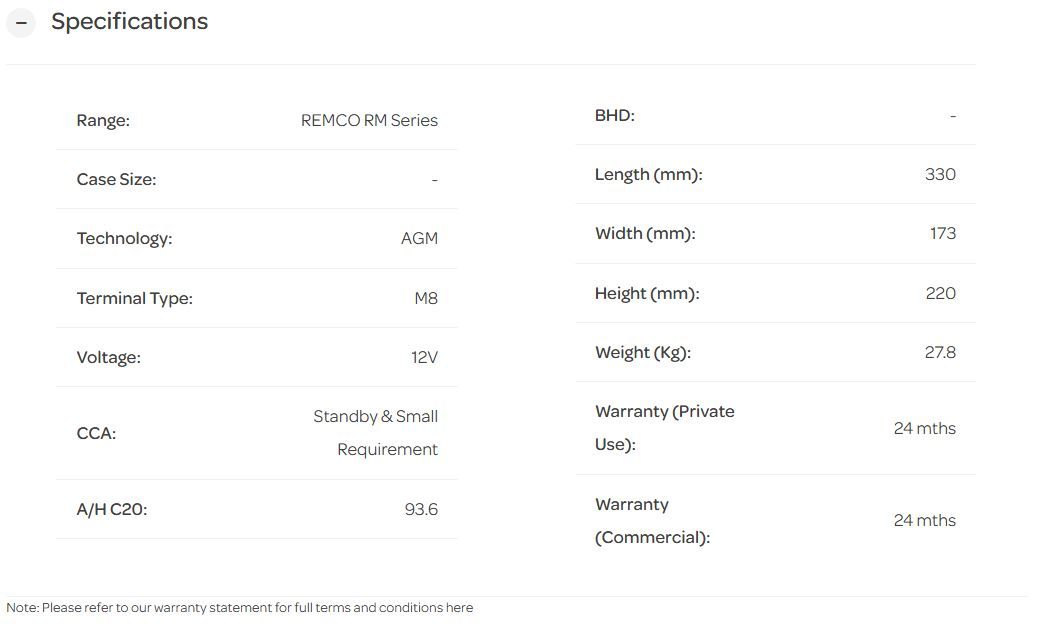 12V 93AH REMCO AGM STANDBY GRP 31 M8 TERMINAL 330MM x 173MM x 220MM