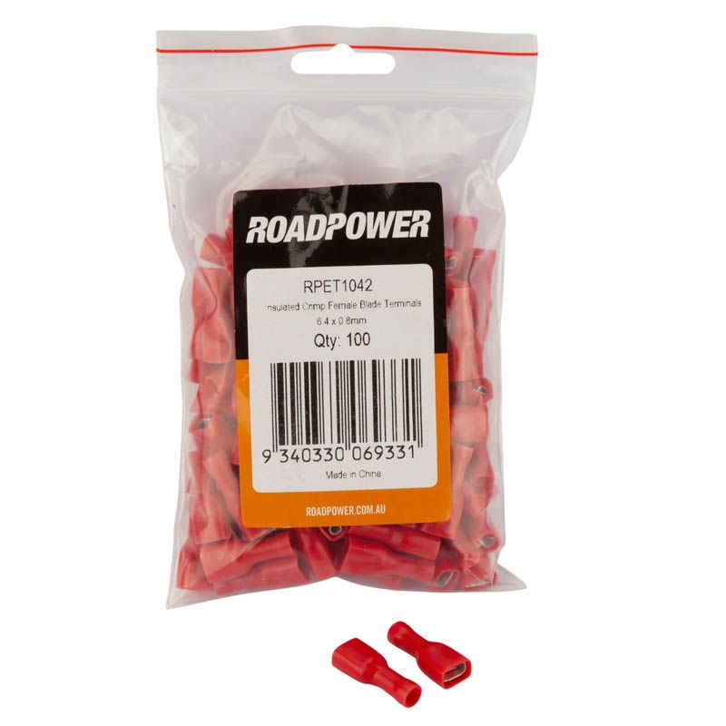 Crimp Terminal Female Blade 6.4mmx0.8mm Fully Insulated Red Pkt 100