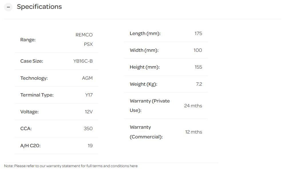 12V 350CCA REMCO AGM PSX POWERSPORT YB16C-B 1 -FA 175MM X 100MM X 155MM