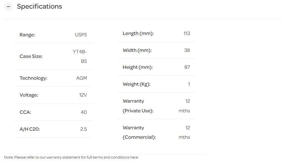 12V 40CCA 2.5AH USPS AGM YT4B-BS 113MM X 38MM X 87MM