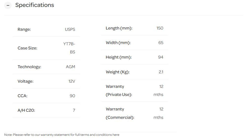12V 90CCA 7AH USPS AGM YT7B-BS 150MM X 65MM X 94MM